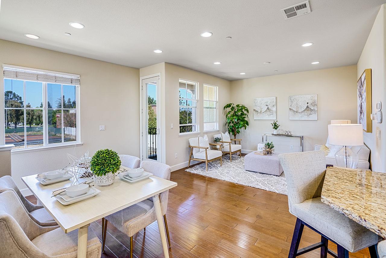 A former model home built by Summerhill Homes. This bright end-unit townhome in sought-after Las Palmas showcases, easy, fashionable living at its finest. Open-concept gathering areas with hardwood floors and a large covered patio unfold from a gourmet island kitchen with stainless appliances, deep sink, and granite-slab countertops. Each bedroom is tastefully appointed, including a spacious, elegant primary suite featuring a walk-in-closet and luxury bath with dual vanities and oversized shower. Amenities like a tank-less water heater and duel pane windows maximize the home’s energy efficiency. Washer and dryer on the bedroom level for convenience. Attached two-car garage with a huge storage space. Access to community features like plenty of guest parking and a clubhouse with barbecue and play pad. Stroll to Las Palmas Park, Trader Joes, Starbucks, and top-ranking Cumberland Elementary (buyer to verify). Nearby are freeways, tech campuses, exciting Downtown Sunnyvale, and more!
